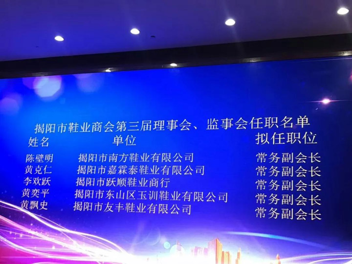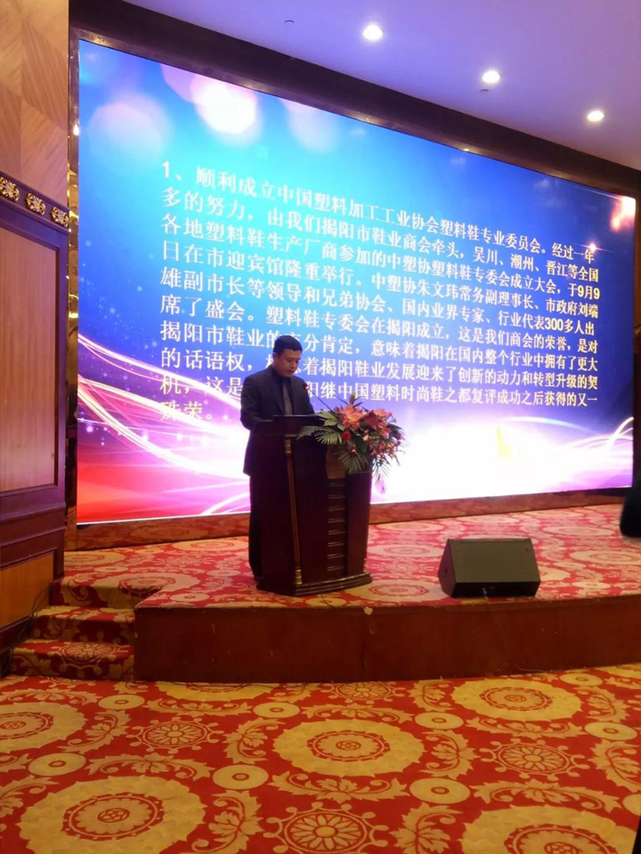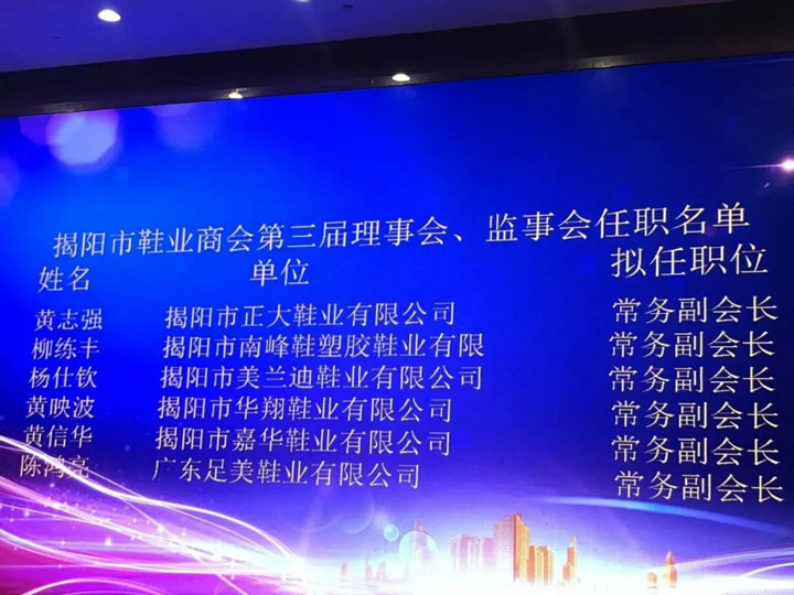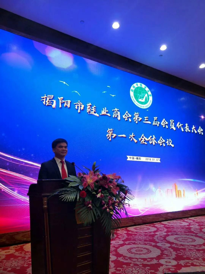 2018年1月7日,商會(huì)在榕江大酒店召開(kāi)“揭陽(yáng)市鞋業(yè)商會(huì)第三屆會(huì)員代表大會(huì)第一次全體會(huì)議”。市民政局領(lǐng)導(dǎo)及一百多家商會(huì)會(huì)員代表參加了會(huì)議。