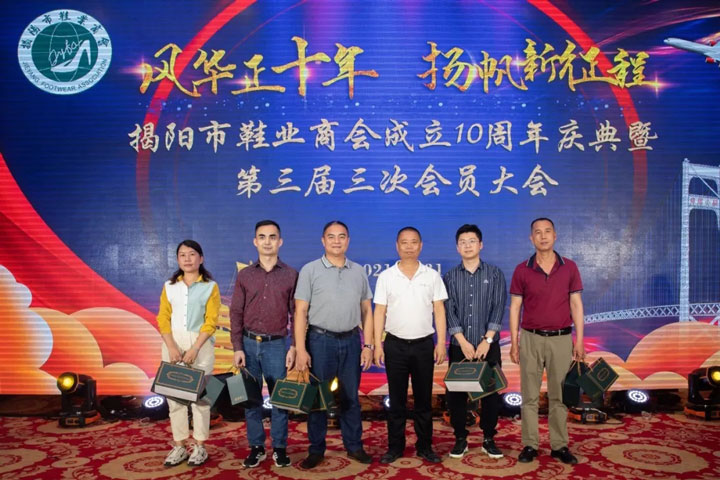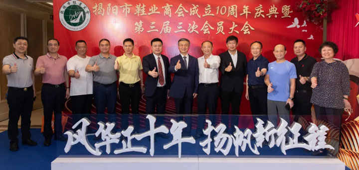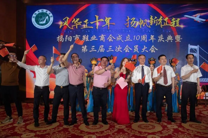 2021年3月31日,揭陽市榕江大酒店錦繡店花燈璀璨,高朋滿座,歌舞盛宴,笑語滿堂。風(fēng)華正十年.揚帆新征程,揭陽市鞋業(yè)商會十周年慶典活動暨第三屆第三次會員大會在此隆重舉行。商會會員歡聚一堂,溝通友情,暢敘友誼,共謀揭陽鞋業(yè)發(fā)展大計,共創(chuàng)商會明天更加輝煌。
